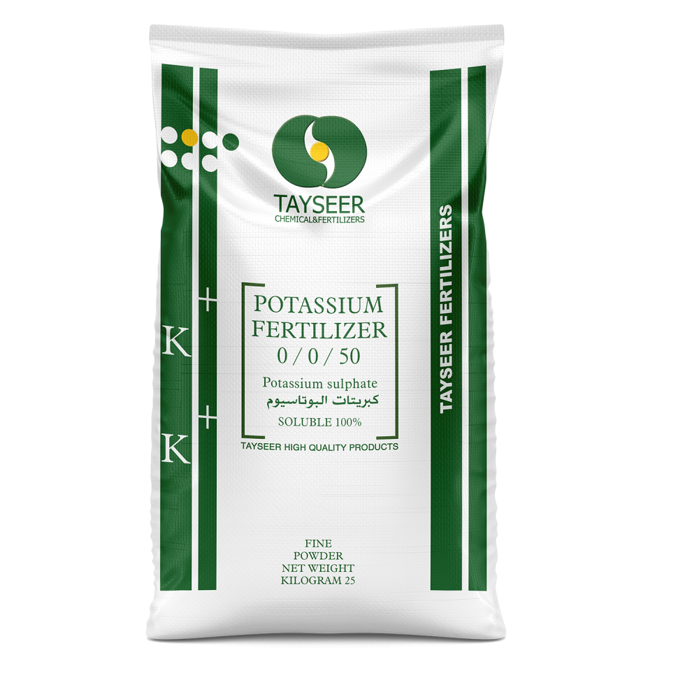 سلفات البوتاسيوم : يلعب هذا المنتج دور هام في توفير الكبريت والبوتاسيوم المهمة في رفع مقاومة النبات. وتحسين عمليات فتح وإغلاق الثغور. ودورها في انتقال المركبات السكرية المصنعة والتي تخزن في الثمار.